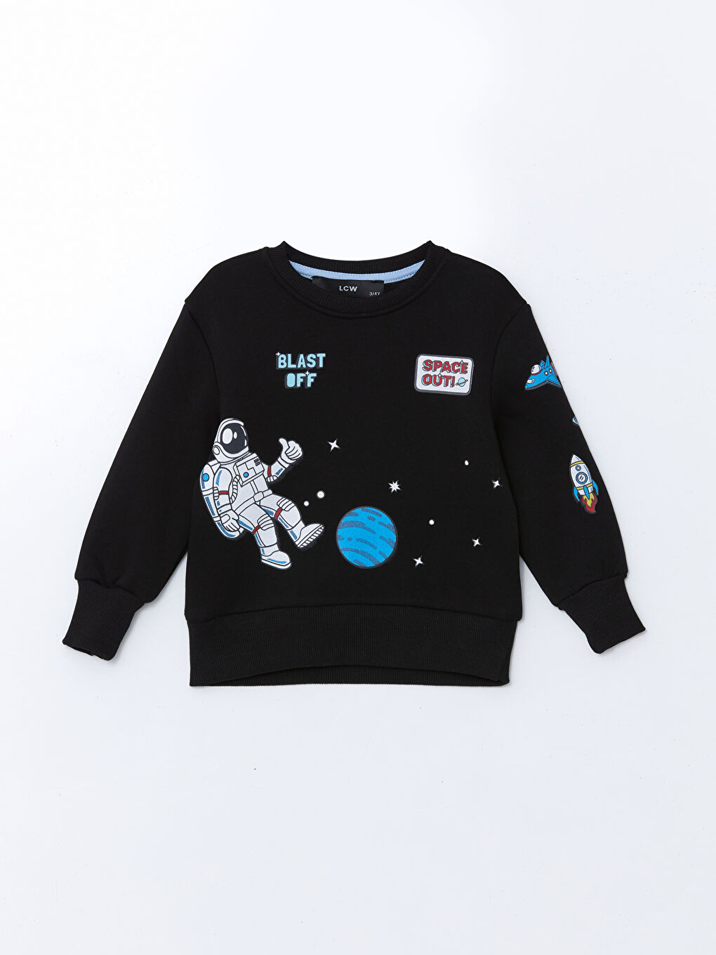 این سویشرت پسرانه یقه گرد آستین بلند از پارچه سه لایه نخی مرغوب دوخته شده است. دارای سرآستین و لبه چیندار و طرح چاپی با تم فضایی است.