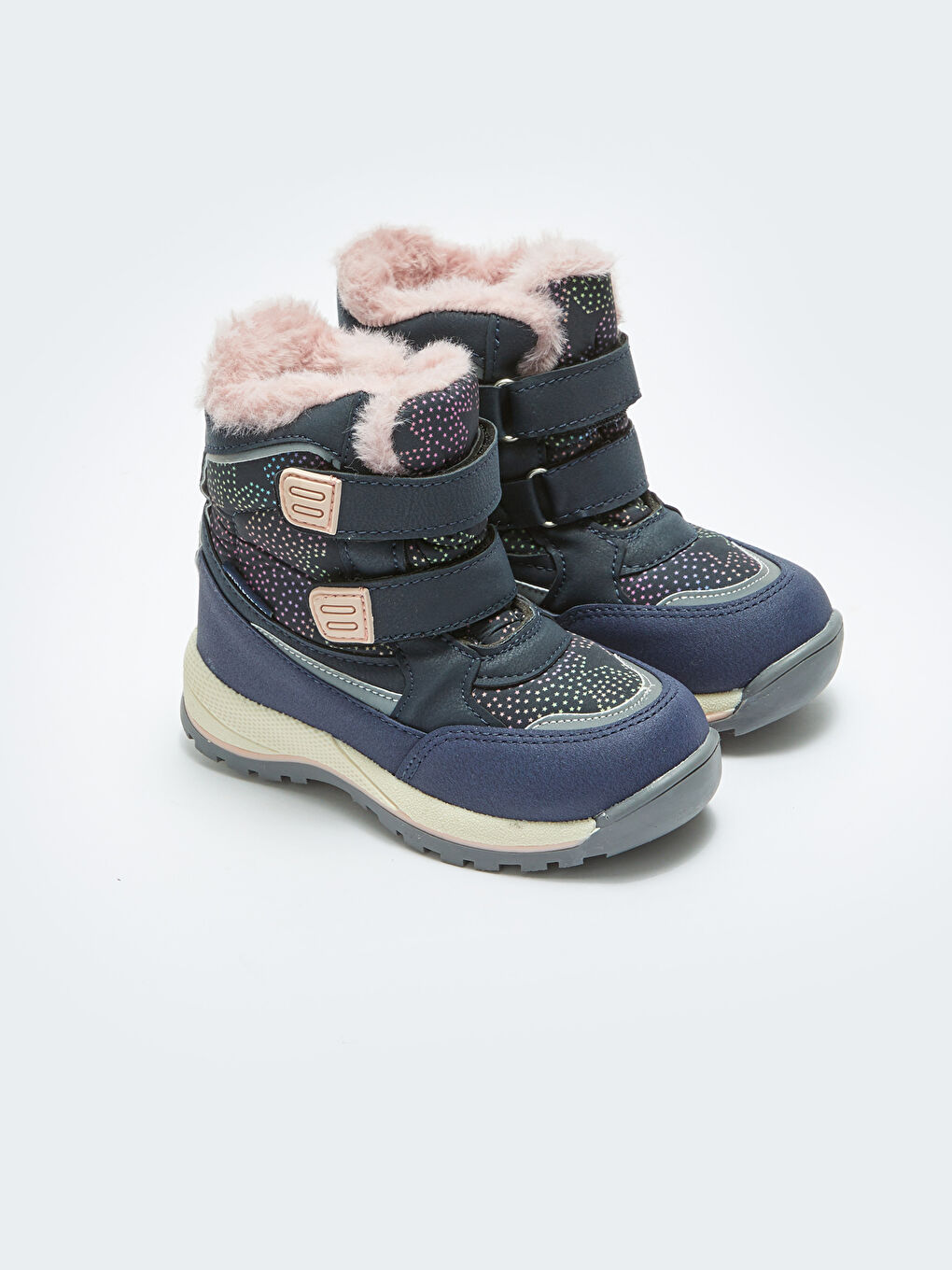 چکمه های دخترانه با طرح خال خالی، بسته شدن نوار چسب، جزئیات خز مصنوعی در مچ پا، و زیره ضخیم.