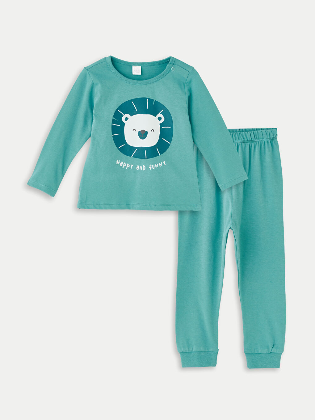 ست لباس خواب نوزاد پسر با یقه خدمه چاپ آستین بلند فیروزه ای