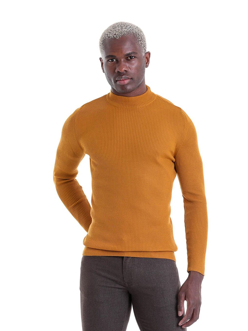 ژاکت پشمی یقه اسکی طرح دار زرد زعفرانی اسلیم فیت