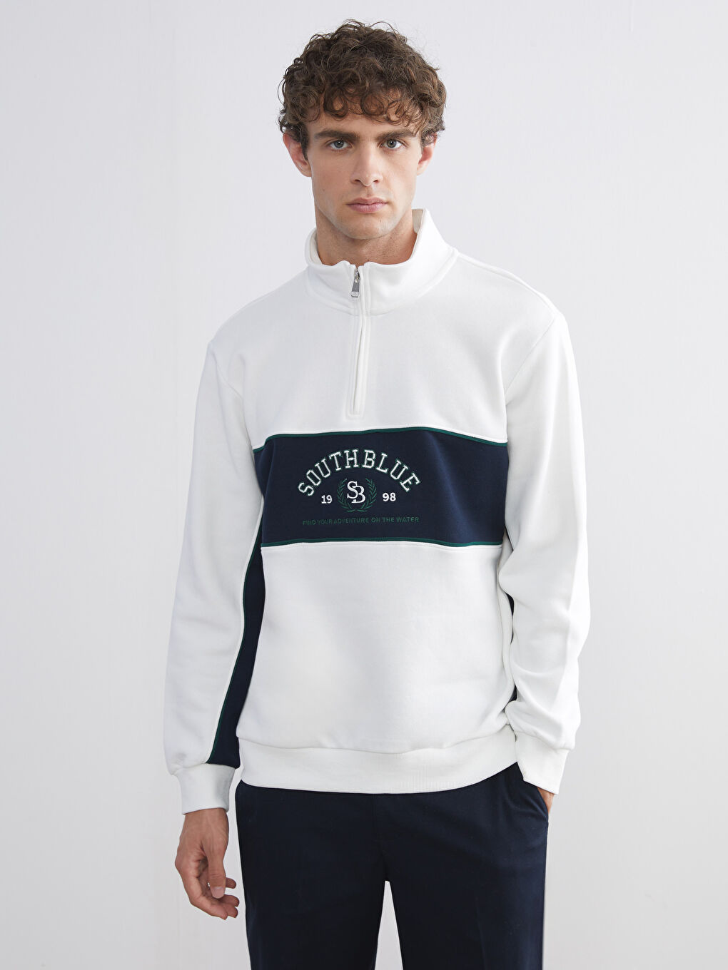 این سویشرت مردانه دارای یقه ایستاده، نیم زیپ و آستین‌های بلند است. در قسمت جلو دارای طرح چاپی رنگی است و از پارچه ضخیم و سه‌لایه برجسته ساخته شده است.
