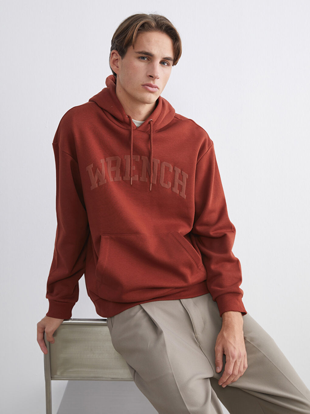 این سویشرت مردانه با کلاه قابل تنظیم و بند کشی، از پشم ضخیم سه‌ریسی ساخته شده است. دارای آستین‌های بلند، جیب کانگورویی و طرح چاپ برجسته در جلو است.